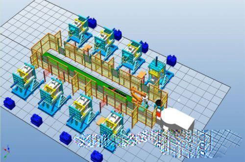 此生產線與布局1相似,由兩臺澆注機器人和兩條軌道系統(tǒng)組成,澆鑄機分布在軌道兩邊,一臺澆注機器人負責一邊的鑄機。澆注機器人接受到鑄機的澆注指令,澆注機器人從熔爐勺取定量的鋁液,然后通過軌道運動到鑄機旁,進行自動澆注,由于兩臺機器人共用一臺熔爐,之間會有一個信號集成。