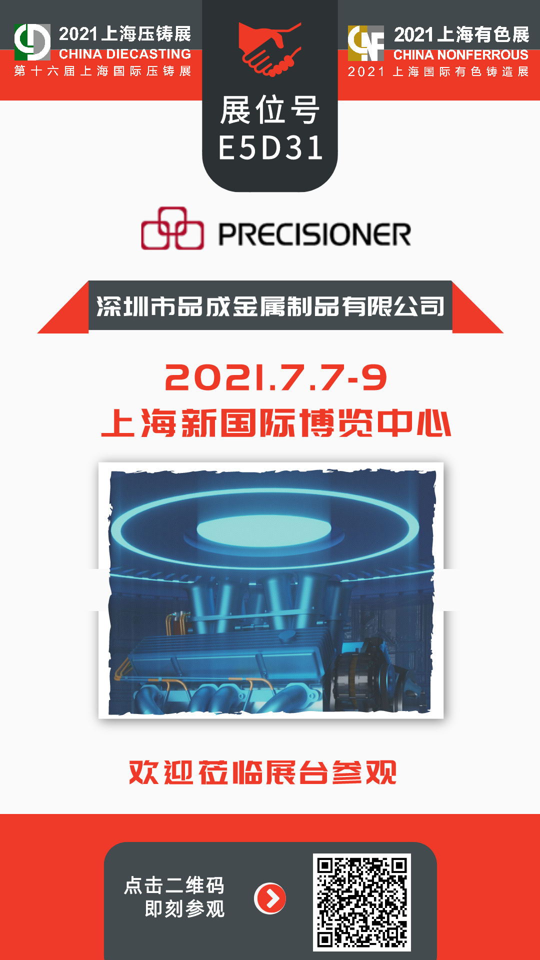 品成金屬將于2021年7月7日-9日參加第十六屆上海國際壓鑄展&2021上海國際有色鑄造展,展位號(hào)為E5D31。該展會(huì)將全方位展示壓鑄及有色鑄造全產(chǎn)業(yè)鏈解決方案,促進(jìn)企業(yè)相互學(xué)習(xí)、交流碰撞和集智發(fā)展,引領(lǐng)行業(yè)未來發(fā)展新趨勢。現(xiàn)誠邀各位行業(yè)人士蒞臨我們的展位參觀,品成全體員工恭候您的到來,一起攜手挑戰(zhàn),共創(chuàng)未來!