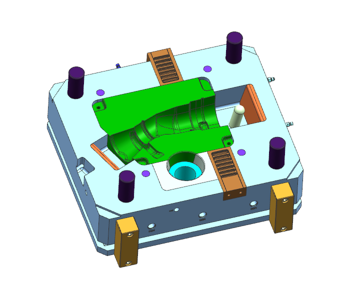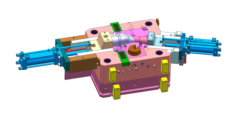 1. 采用撘底的入料方案,產品表面的造型不會因排布入料進行打磨而產生變形; 2. 模具結構采用機械力先將行位撥動5-10.00mm,油缸在抽出產品,有效減少行位抱緊在產品內; 3. 兩個大行位的冷卻系統設計合理,有效的保證了產品生產的良品率; 4. 經測試,其壓鑄件的氣密性、穩定型以及鑄件的強度及耐磨性完全符合汽車配件的標準要求。