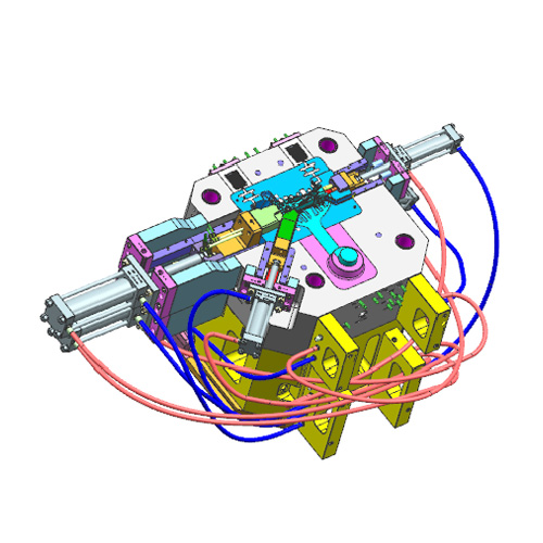 大角度斜行位,采用彎銷結構,斜行位運行前,彎銷先松動斜行位。斜行位合模后,彎銷鎖緊斜行位,避免生產時斜行位退位。還包含有一處行位鎖緊行位的結構。